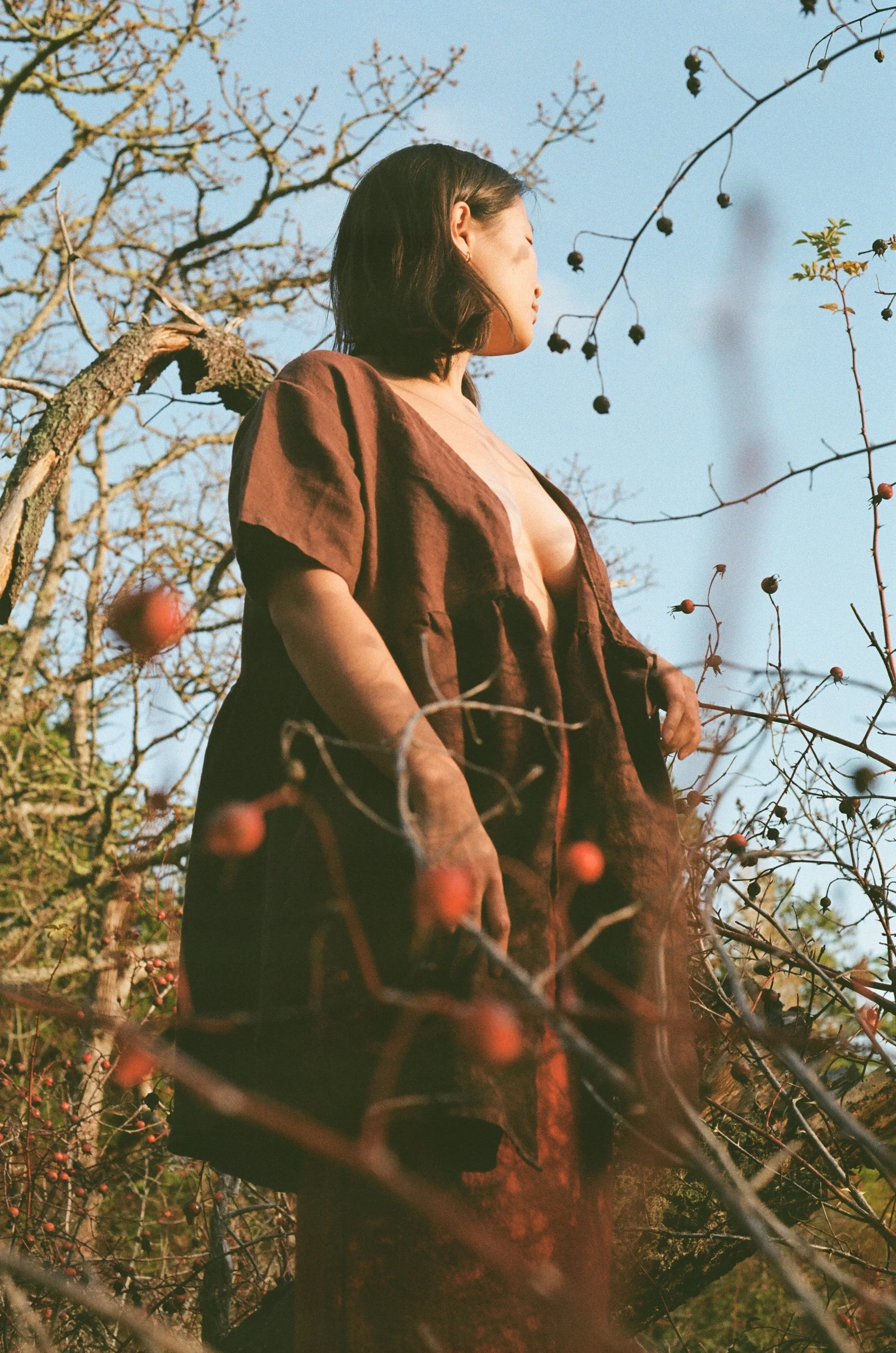 Available and Ready to Ship! Linen, silk, wool, and cotton in textures soft and thick. Plump reds, brambled greens, dark and warm and meant to hold you through midwinter’s crispness. A thorn prick of startling bright warmth in clothing form.